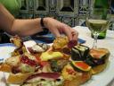 These treats are what the residents of Basque country call pintxos (pronounced pinch-oss), the delicious and colourful treats that pass for dinner in the far north of Spain. Here, lunch seems to be the main meal of the day, so by day’s end the locals are looking for light and tasty mouthfuls to wash down with one of their region’s white or red Rioja wines. In this selection of one dozen pintxos, Maria and I identified ingredients as varied as stuffed squid, omelette-wrapped tuna with some sort of cranberry garnish, prawn and roasted red pepper, and wafer-thin slices of artichoke and cured meat.