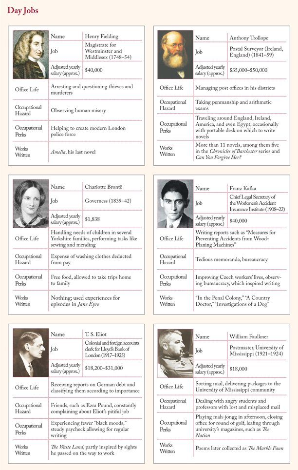 Lapham’s Quarterly has published this subscription-teaser on their website today, revealing a handful of diverse paid occupations of well-known writers over the past three centuries. While it’s hardly a representative sample, I was relieved to find that none of them held down jobs as a writing instructor, content developer, freelance journalist or book reviewer. The perks and hazards attributed to each role remind me that observing human behaviour is an enduring perk (and sometimes trial) of most work environments. My favourite item from the chart is learning of Faulkner’s penchant for Mah-Jongg, which I last played as a kid with my happy-clappy neighbour with what I’m certain was no heed to the rules of the game. Possibly a useful lesson after all, given the eclectic roads to publication mapped below.